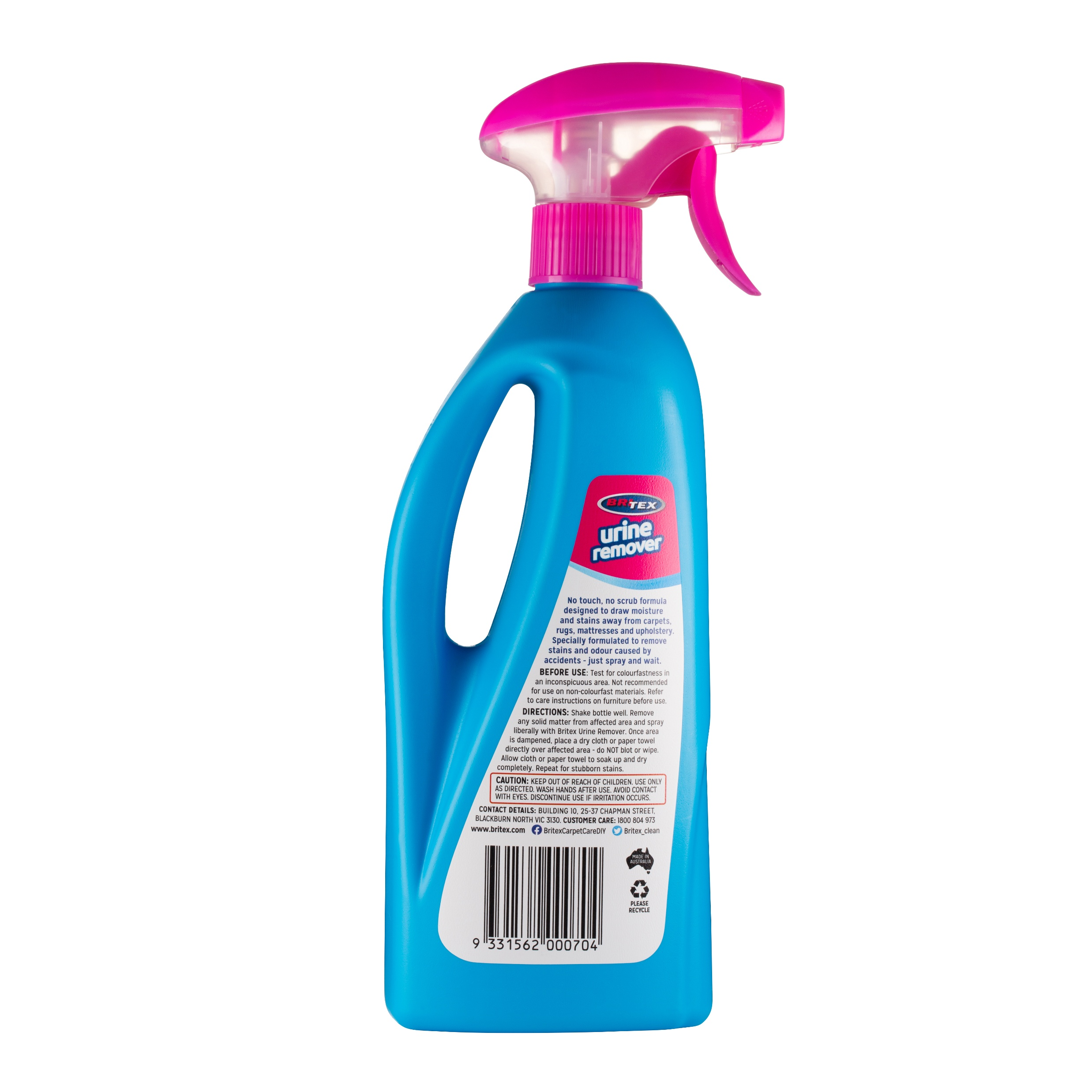 The unique ‘no touch’ Britex Urine Remover is designed to draw moisture from old and new urine stains up and away from carpets, rugs, mattresses and upholstery – just spray the area, apply paper towel or a cloth and wait – no touching, rubbing or scrubbing is required.